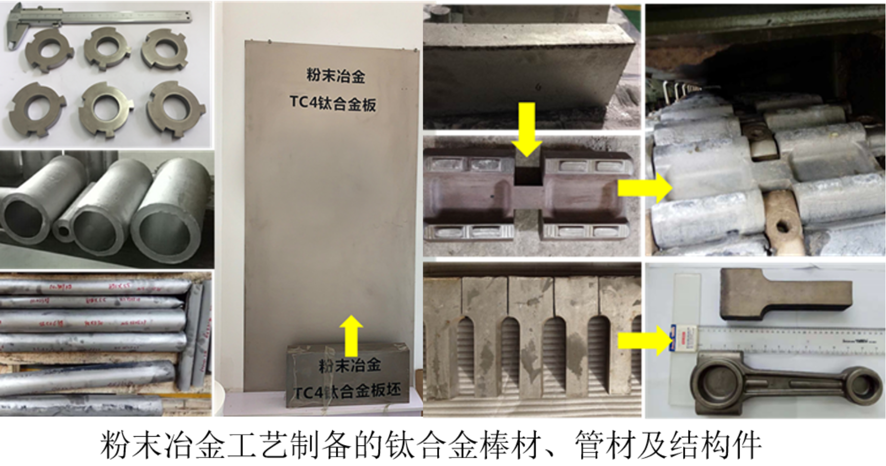 技术团队突破了微细HDH钛合金粉末的低氧控制技术,形成了具有自主知识产权的低成本高性能粉末冶金钛合金生产技术,并在天津某金属材料企业落地量产,建成年产200吨高性能粉末冶金钛合金生产线。目前,生产-100目、-200目、-325目、-500目等不同规格HDH钛粉产品,满足GB、GJB、ASTM、YS相关标准要求。利用粉末冶金技术,实现高性能粉末冶金致密棒坯、管坯和板坯的生产,产品直径可达300mm,长度1500mm,经过变形加工后抗拉强度945-1030MPa,屈服强度885-980MPa,延伸率14-17%。