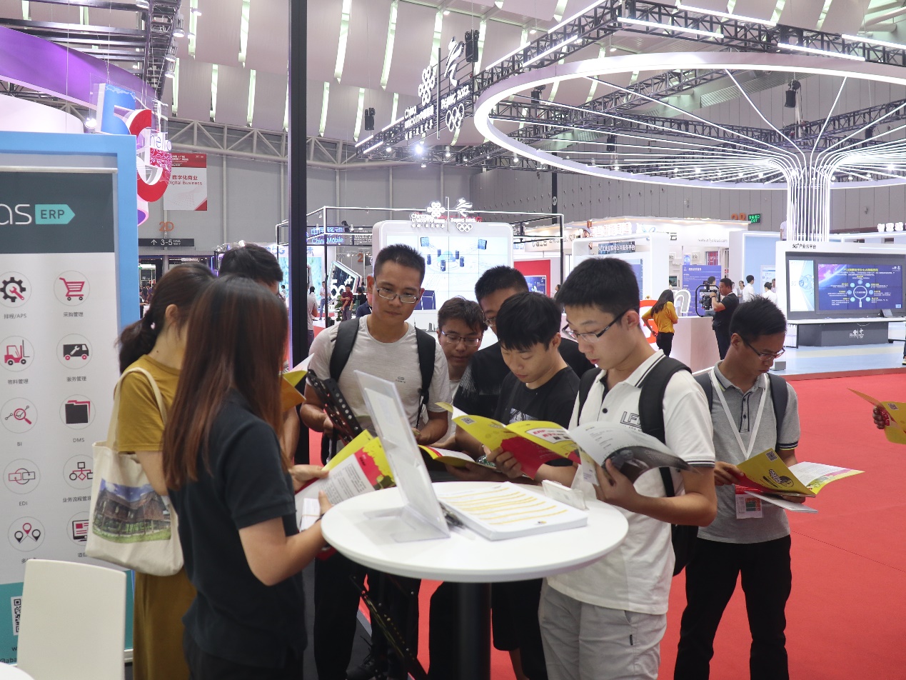 图为2号展馆德国abas展位,同学们在咨询企业ERP系统的应用优势
