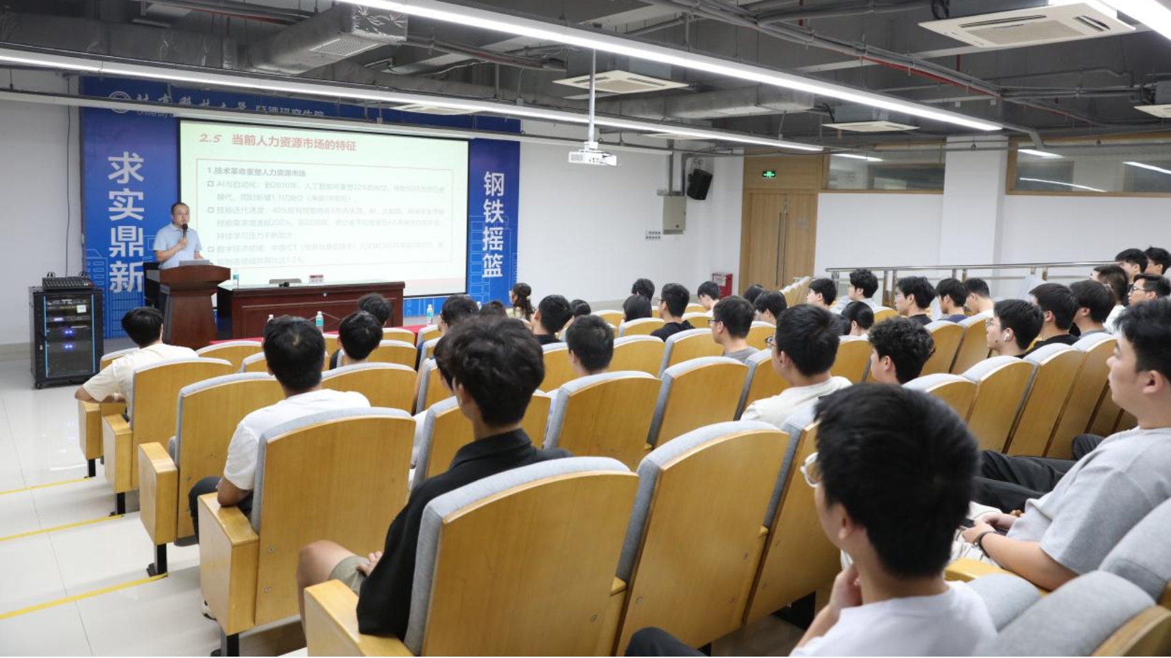 郭东旭带领同学们学习了党的二十届四中全会精神,并深入阐释了建设科技强国、推进科技自立自强的战略意义。结合当前人力资源市场的特征,他分享了一组组人才需求数据,“2024年制造业技能人才缺口超3000万,结构性矛盾突出。”他强调,当前我国正处在建设世界科技强国的关键时期,粤港澳大湾区作为国家战略高地,佛山作为制造业强市,其产业升级的迫切需求与高端人才的结构性短缺,为青年学子提供了前所未有的发展机遇。“同学们要准确把握时代大势,保持对未来的坚定信心,勇于迎接变化挑战,在服务国家战略中实现人生价值。”